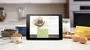 A circular smart doorbell with a camera on top, displaying a message that says 'Welcome Home!' in the center, mounted on a textured dark gray wall. View fullsize