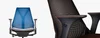 Two modern office chairs, one with a blue mesh backrest and the other with a dark brown backrest, are shown against a white background.