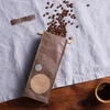 Several packages of coffee in colorful paper bags displayed on a brown background. Each bag has a round label with their respective coffee names and details.