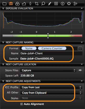 Before shooting, I setup the appropriate naming convention. Other settings I use are Copy from Last in the "ICC Profile" and Copy from Clipboard in the "All Other" dialog boxes.