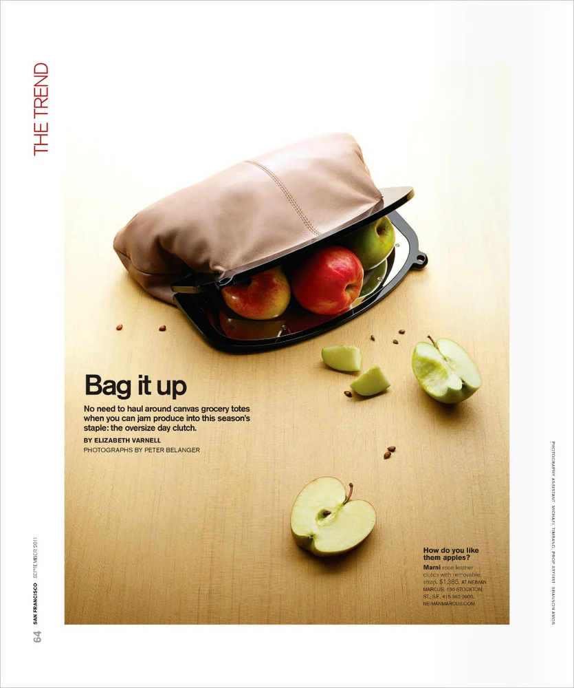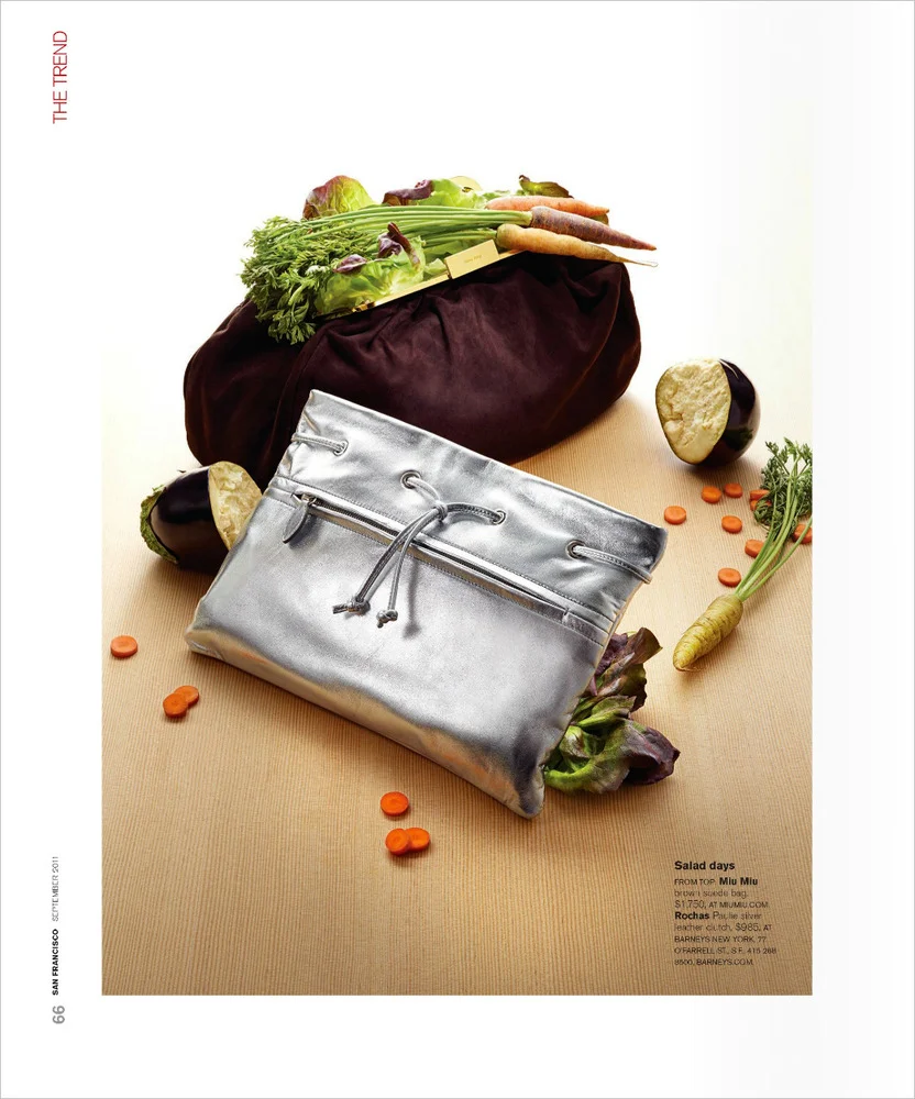 Now that the we finally got the blog up and running with Posterous, we are playing catch up with a few new blog posts of recent work. The September 2011 issue of San Francisco Magazine includes three of my photographs in it's "The Trend" section. This time, we got to work with fancy, designer clutch bags and incorporate fruits and vegetables. Shannon Amos (stylist) came through in the clutch to provide good quality and photogenic produce.