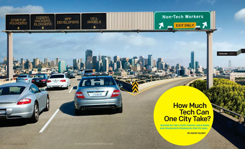 After talking with them about what they needed I set out to photograph all the parts to create something that looked realistic. San Francisco may have lots of roads with views like this one, but none of them conveyed what I was looking for. Often I would find a good location and have to drive it multiple times to get a good shot with no traffic or the right lighting. I photographed lots of roads, cars, city views and signs to create a composition that aligned with the essence of the feature article. It was like working on a puzzle of photos.