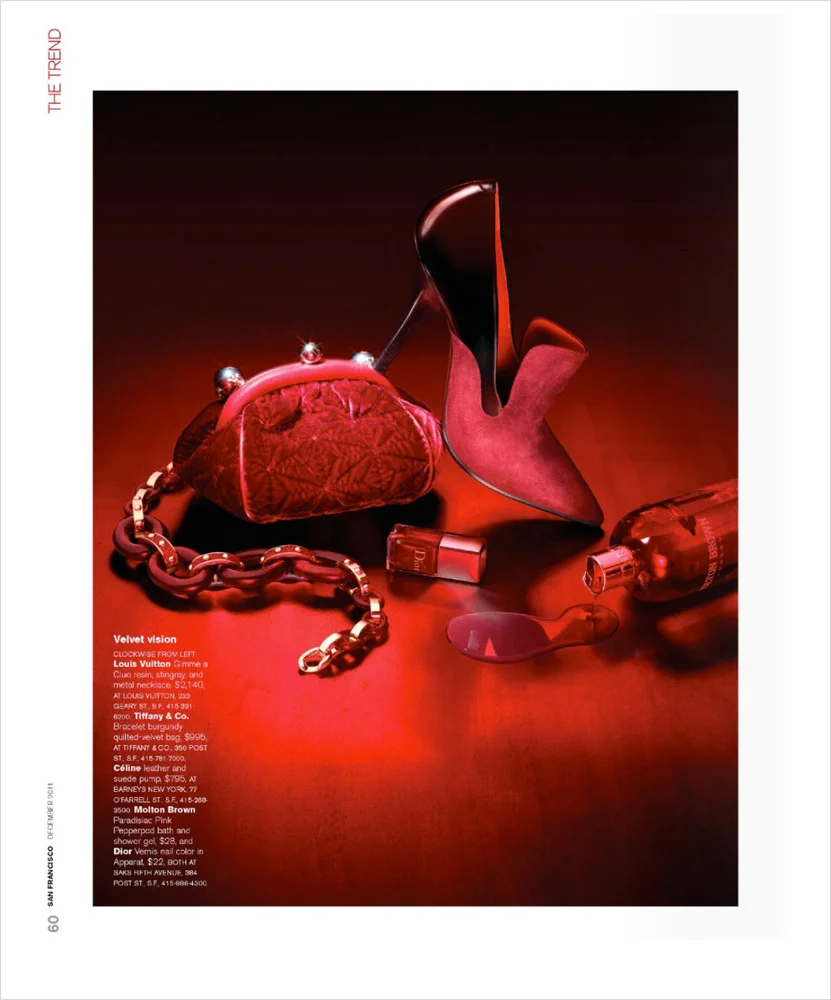 San Francisco Magazine approached us with a fun idea for "The Trend" section of the December 2011 issue. They wanted to incorporate the color red in an over-the-top fashion. They provided a selection of red products to pick from to form the groups...